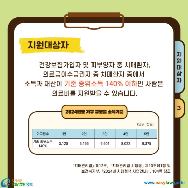 지원 대상은 기준 중위소득 140% 이하인 가구로 한정됩니다. 즉, 치매환자의 소득 수준이 기준 중위소득의 140% 이하여야 지원을 받을 수 있습니다. 기준 중위소득은 매년 정부에서 발표되며, 지역별로 차이가 있을 수 있기 때문에 지자체별로 소득 기준이 다를 수 있습니다.